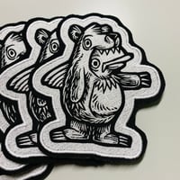 This is a one color woodcut, hand-printed on an embroidered patch. This patch is approx. 4.5"x 5.25" in size. Each patch is hand made and may vary slightly from the patch in the photo.