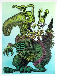 This is a 16" x 22" painted and printed woodcut print, carved painted and printed by the artist. This Alien Rabbit monoprint was printed in a series of 5 unique color variants on Rives 100% cotton rag paper cut to 18"x24"