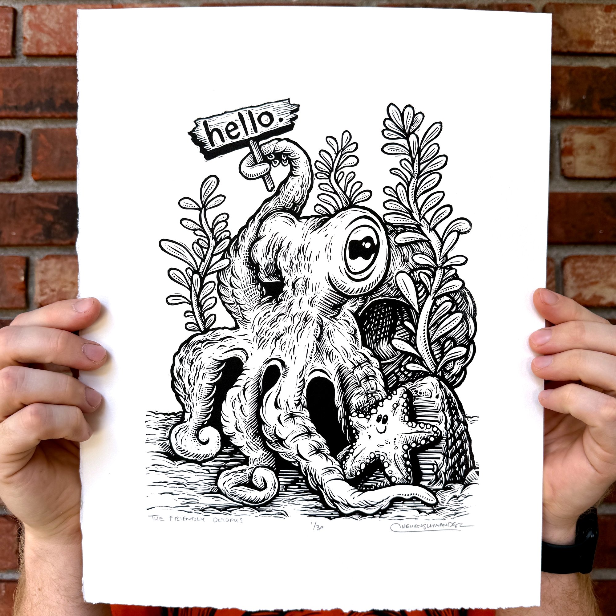 This is a 11" x 14" linocut print, carved and printed by the artist. This affable cephalopod was printed in an edition of 30 on Rives BFK paper cut to 11" x 14"